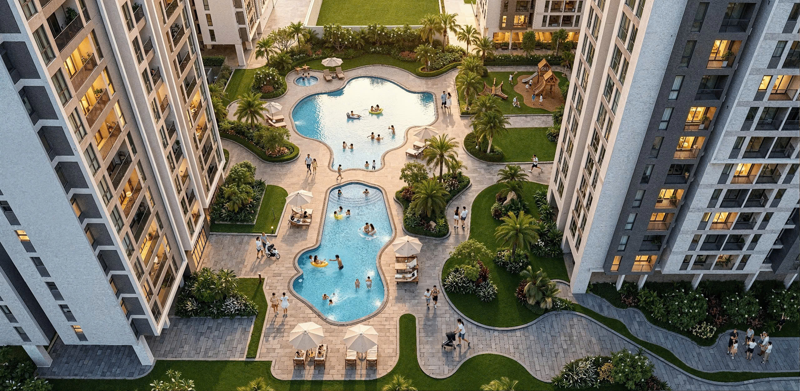 Không gian cây xanh mặt nước rộng lớn (khoảng 20–21 ha), sân vườn, lối đi bộ.